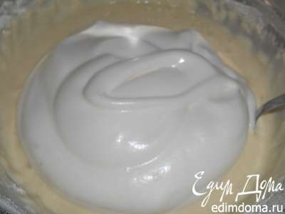 отделить желтки от белков,белки взбить в пену,добавить 70 г сахара и взбивать до образования мягких пиков