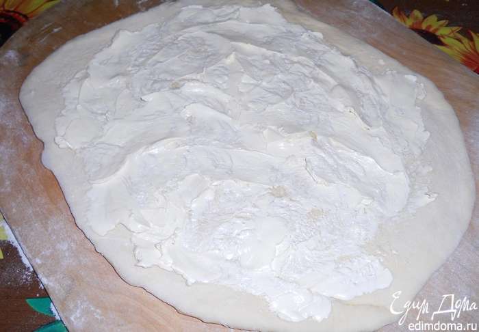 Теперь раскатываем наше тесто и смазываем поверхность хорошо размягченным маслом(используем все масло, которое осталось).